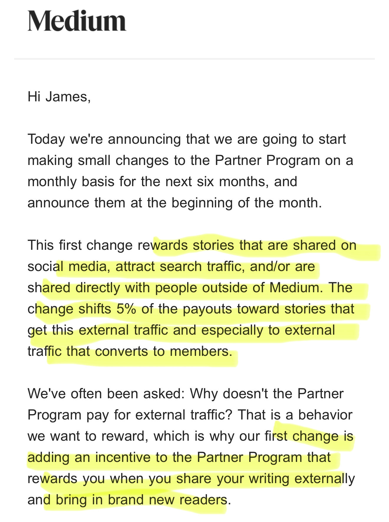 Medium started by announcing that 5% of payouts would now go to stories that are shared on social media, attract search traffic, and/or are shared directly with people outside of Medium.